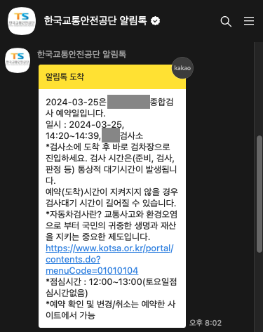 또한 카카오톡으로 알림톡이 와서 검사 날짜 및 시간을 쉽게 확인할 수 있다.