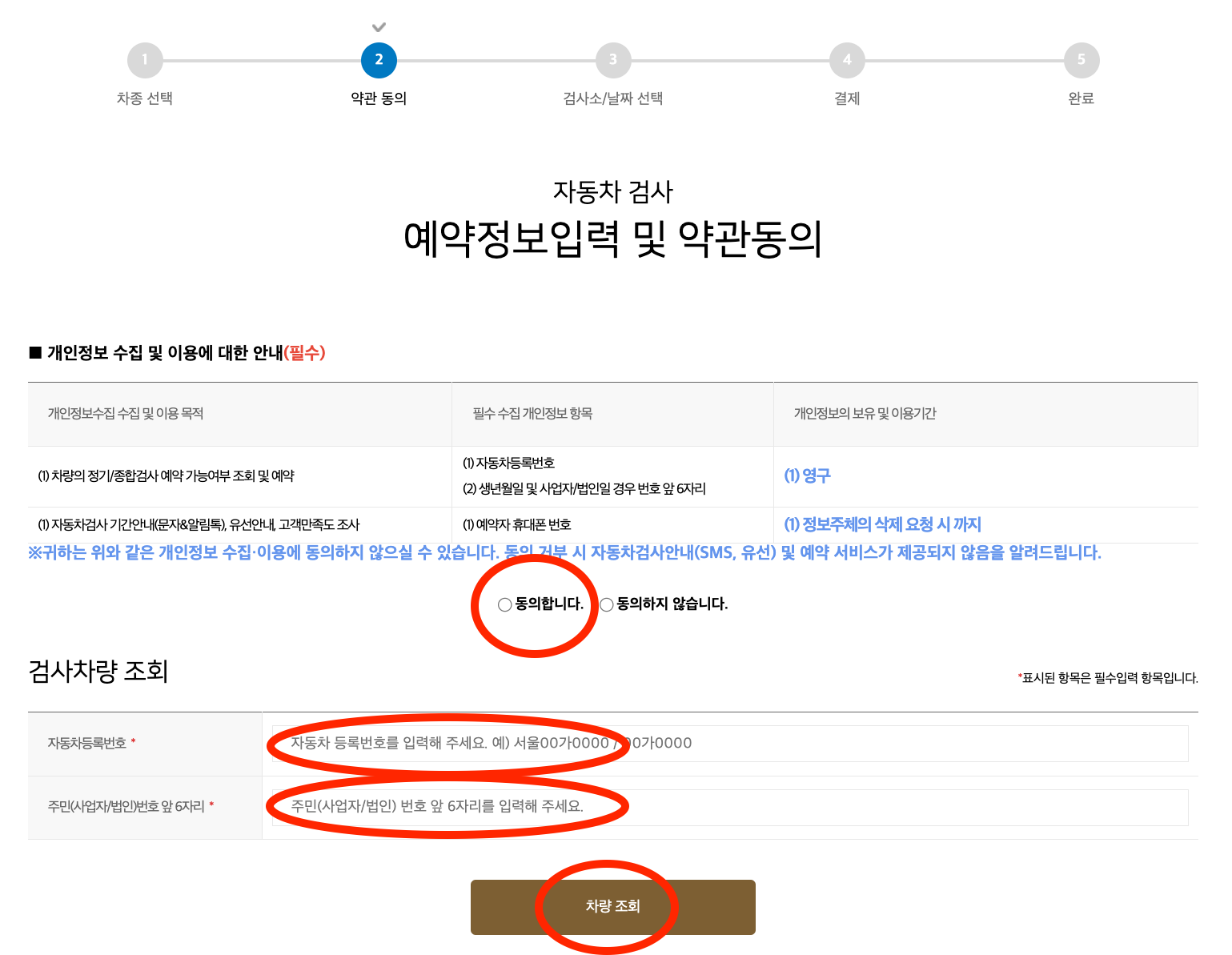 약관 동의 후에 검사할 차량 번호와 주민번호 앞 6가지를 입력하고 차량 조회를 누른다.