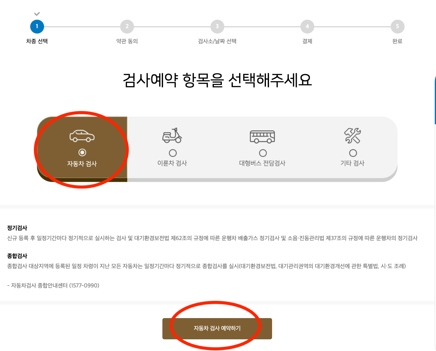 자동차검사 예약 사이트에 접속하면 먼저 차종선택을 한 후에 자동차 검사 예약하기를 선택한다.