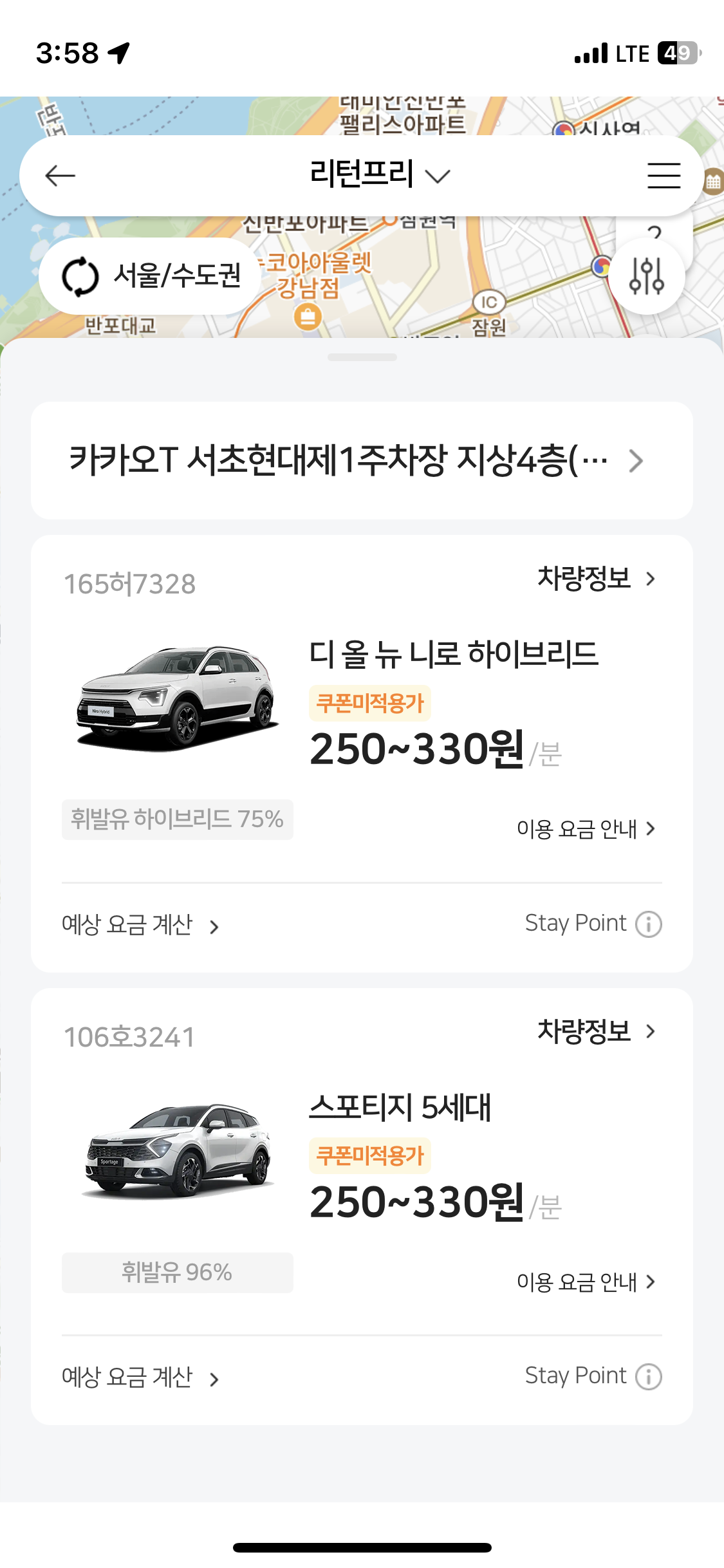 리턴프리를 누르고 지도상에서 내가 출발할 지역으로 이동해보면 아래 왼쪽사진처럼 프리존이 표시된게 보인다. 숫자가 써있는 곳은 렌트할 수 있는 차량의 대수이다. 숫자가 써있는 프리존을 누르면 여기에서 렌트할 수 있느 차량과 가격이 보인다.