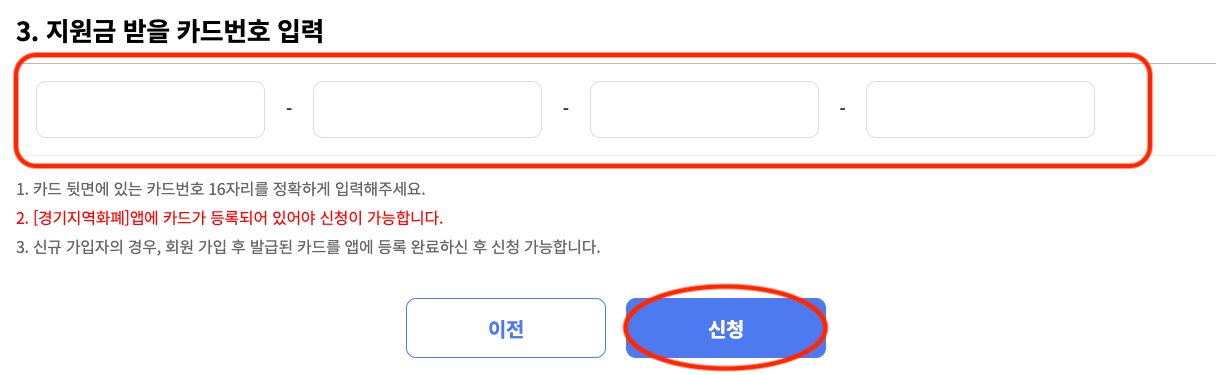 확인버튼을 누르면 아래와 같이 지원금 받을 카드번호를 입력하는 란이 나온다.