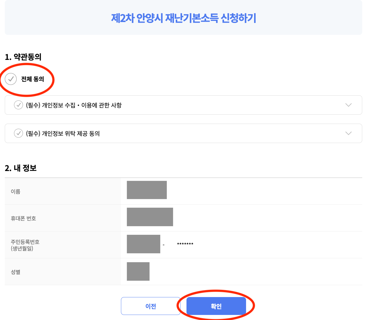 본인인증을 완료하면 아래와 같이 신청하기 페이지가 나오고 약관동의 후에 확인 버튼을 누른다.