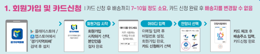 앱을 실행하여 회원가입후에 카드 신청하기를 하면 된다. 이때 꼭 지역은 안양시를 선택하여 주자.