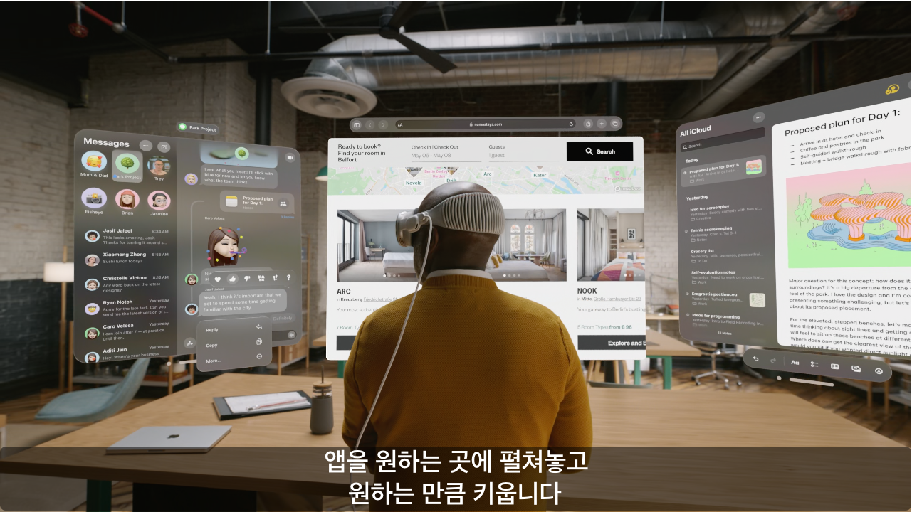 공간 컴퓨팅이라는 단어가 가장 잘 어울리면서 사용할때 가장 매력적으로 다가오는 것이 바로 이 디스플레이다. 내 주위의 모든 공간이 스크린이 되는 마법과도 같은 일이기 때문이다.