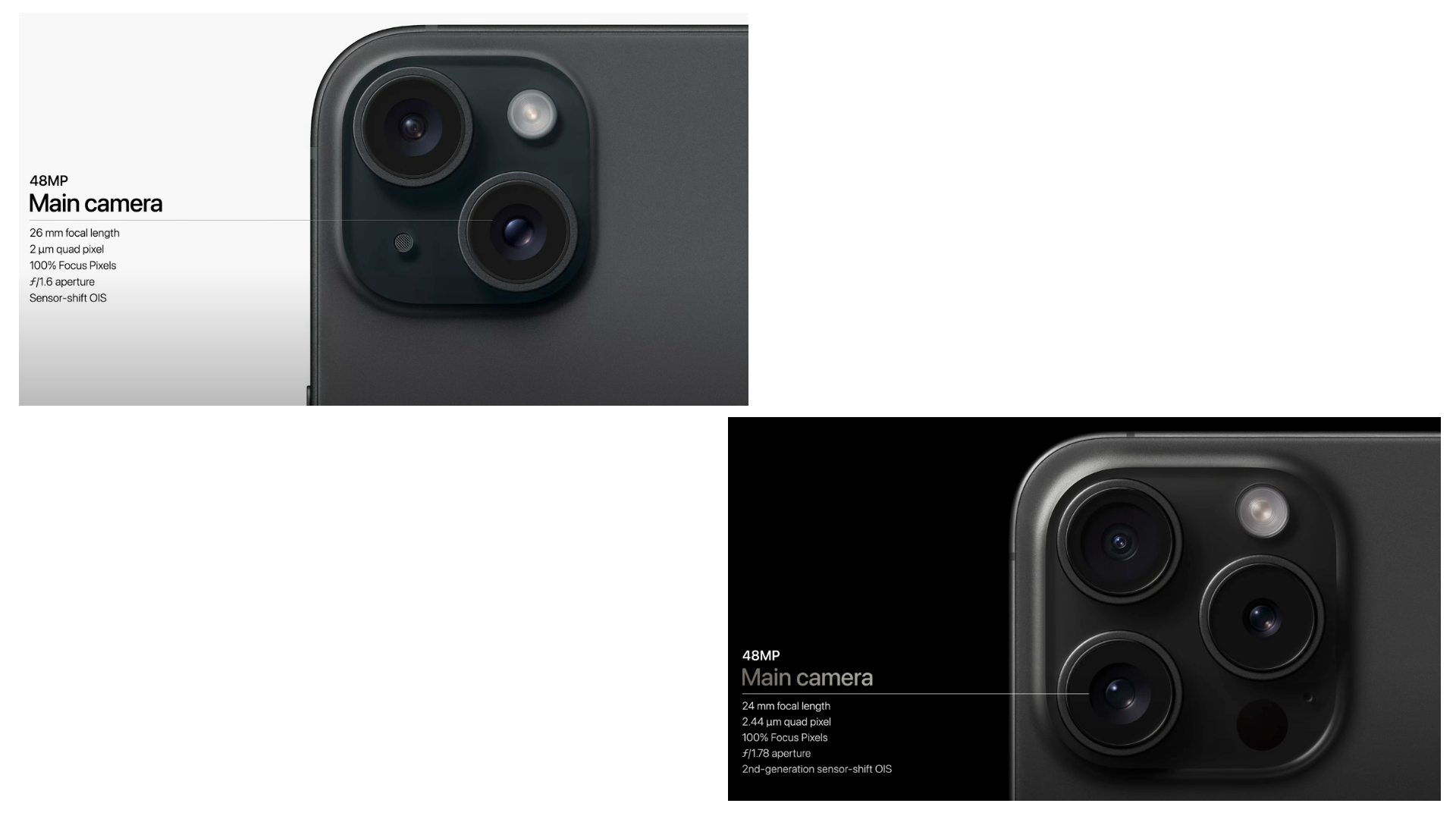 기존의 시리즈와 마찬가지로 아이폰 15 Pro급에만 망원 렌즈가 있다. 그럼에도 불구하고 아이폰 15 에서도 2개 광학 줌이 가능한 것을 볼 수 있다. 이것은 48MP 초고해상도 카메라를 사용하여 광학 풀질과 같은 2배 광학 줌을 가능하게 해준다고 한다.