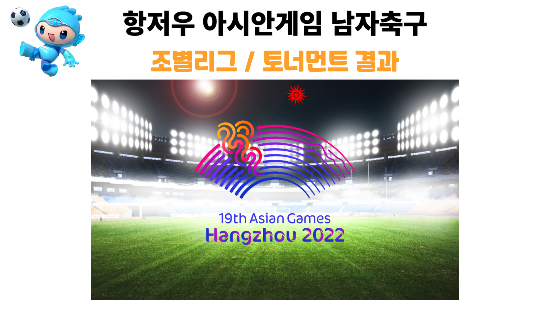 2023년 현재 중국에서 열리는 2022 항저우 아시안 게임 남자 축구 조편성 및 경기 결과이다. 남자 축구에 관심이 많은 분들을 위해 보기 쉽게 6개 조편성 및 조별리그 결과와 순위를 정리하고 결선 토너먼트까지 지속적으로 업데이트하겠다.
