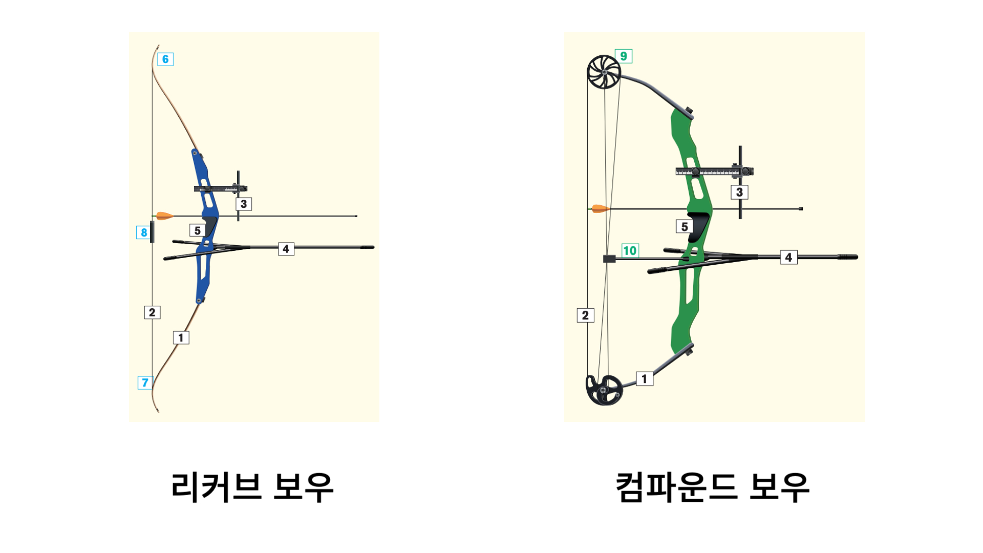 - 컴파운드 : 약한 힘으로도 시위를 당길 수 있는 도르레가 활 끝에 달려있는 기계식 활