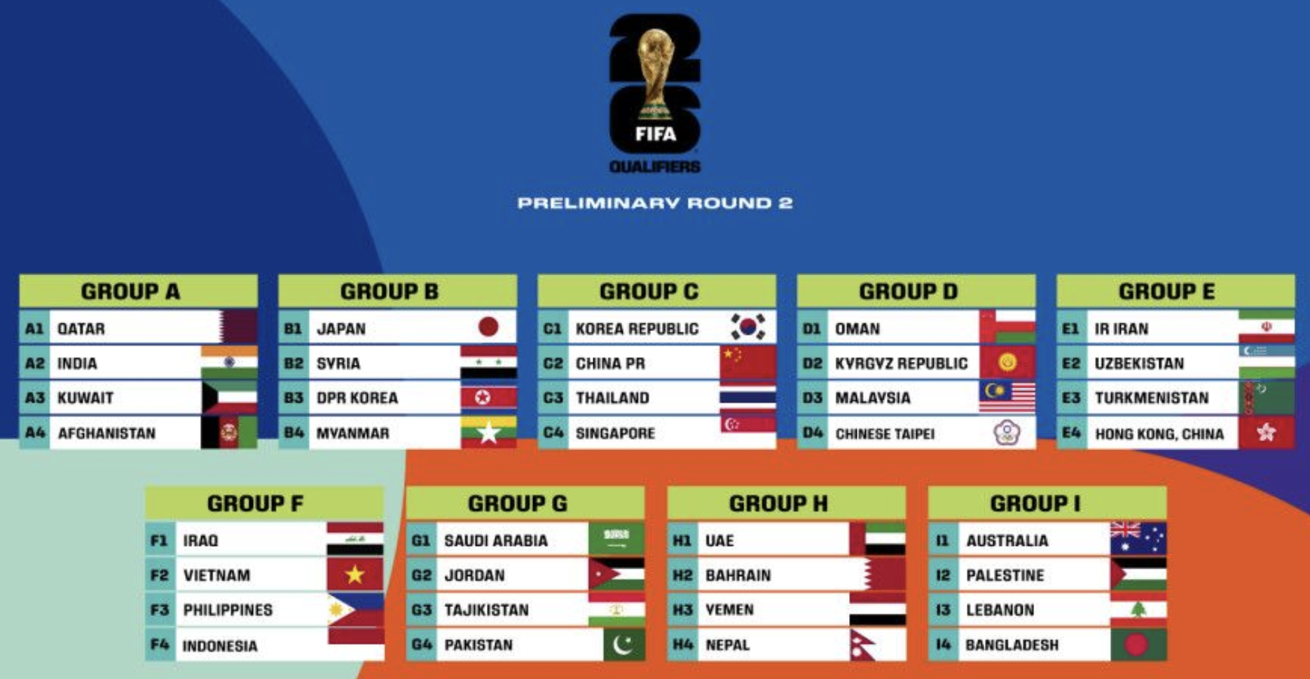 - B조: 이라크 🇮🇶, 오만 🇴🇲